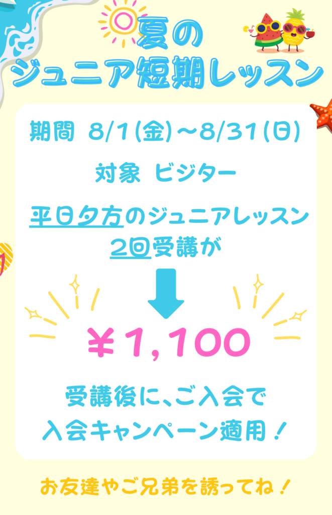 8/1(金)〜8/31(日)で平日ジュニアの通常レッスンを2回ご受講いただけます